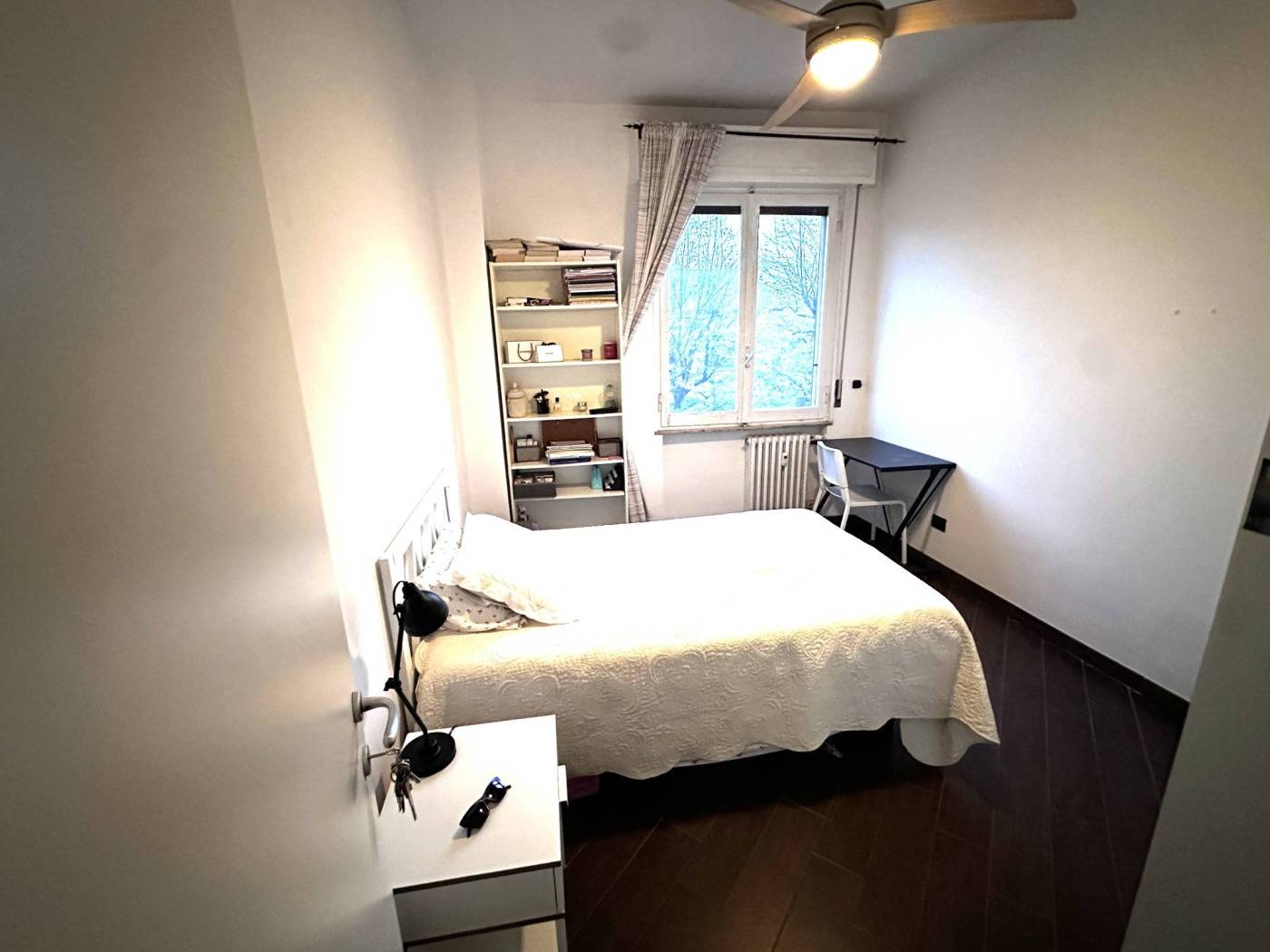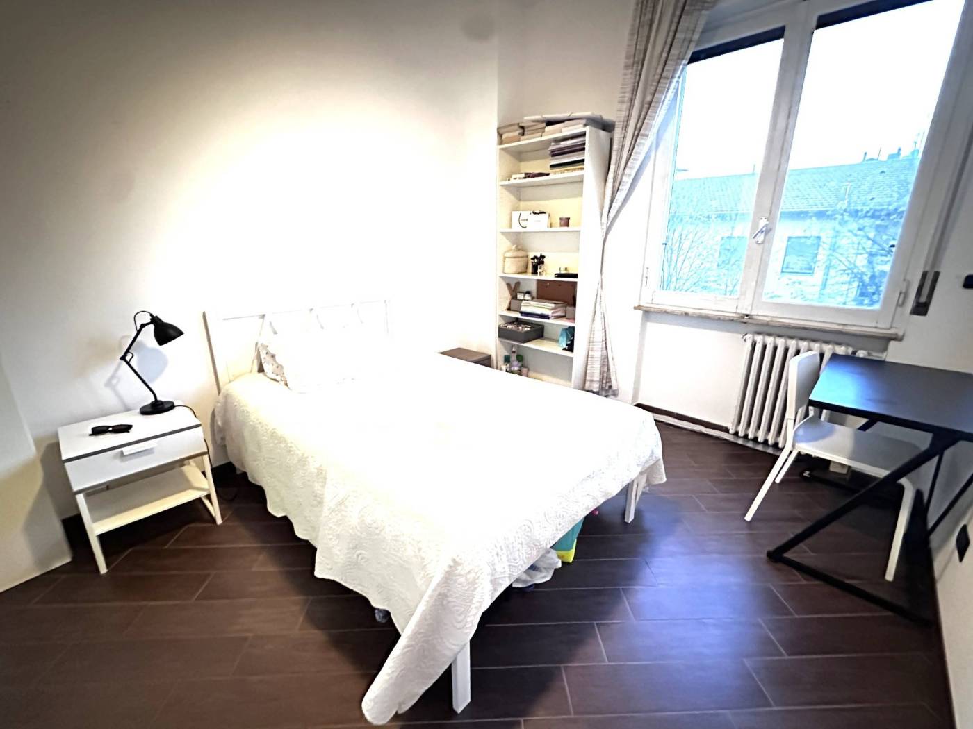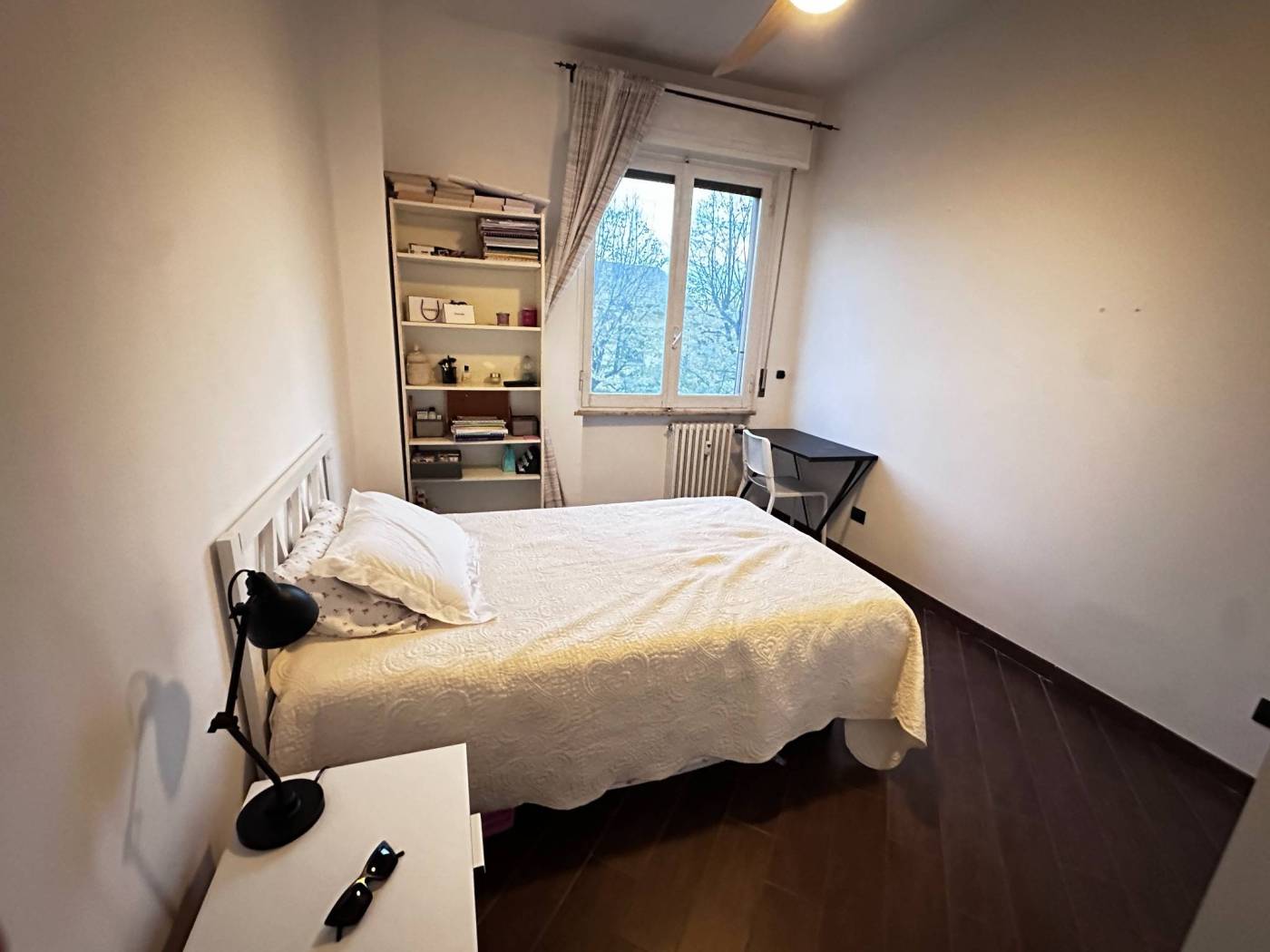 La camera è arredata con letto piazza/mezzo con struttura, due comodini, armadio a due ante con cassetti, libreria e scrivania con sedia.