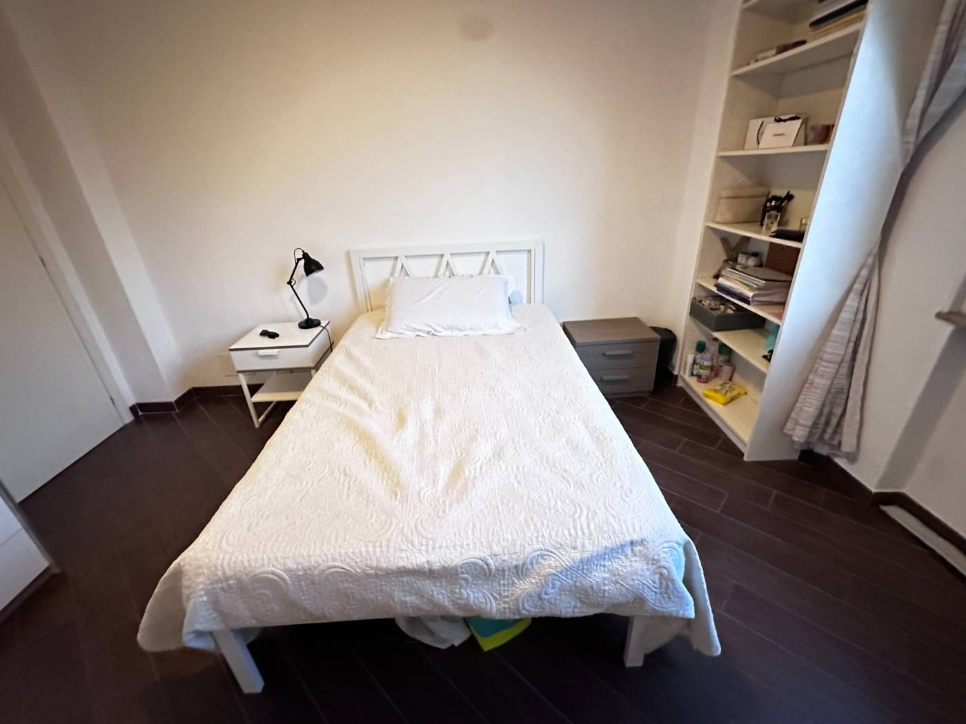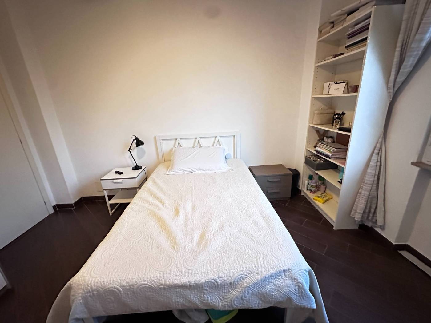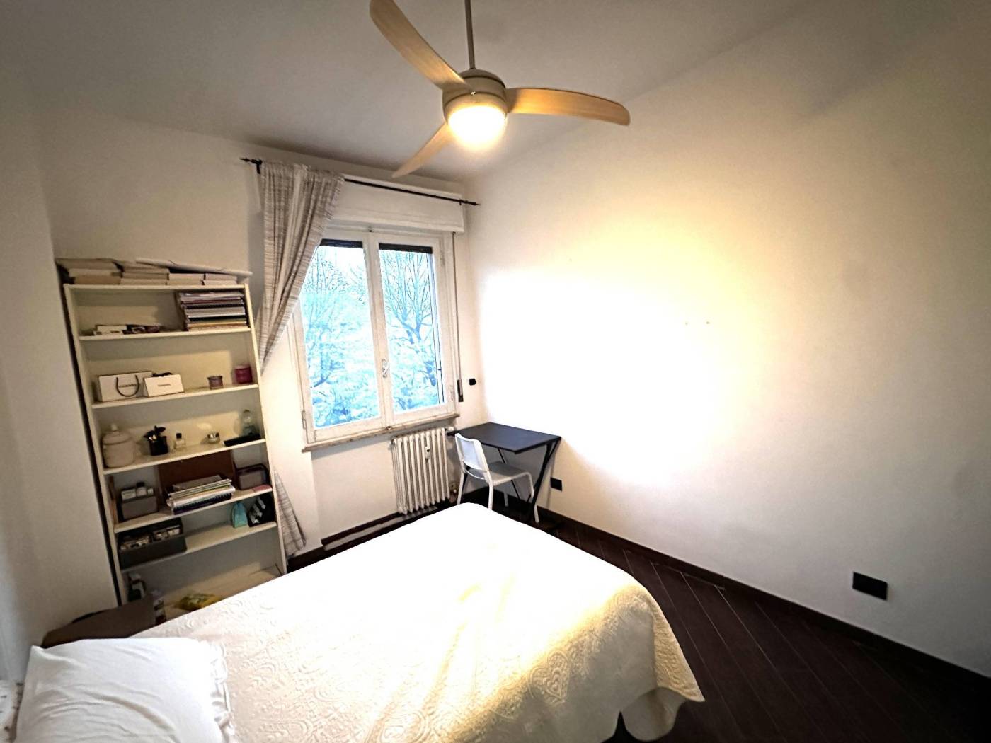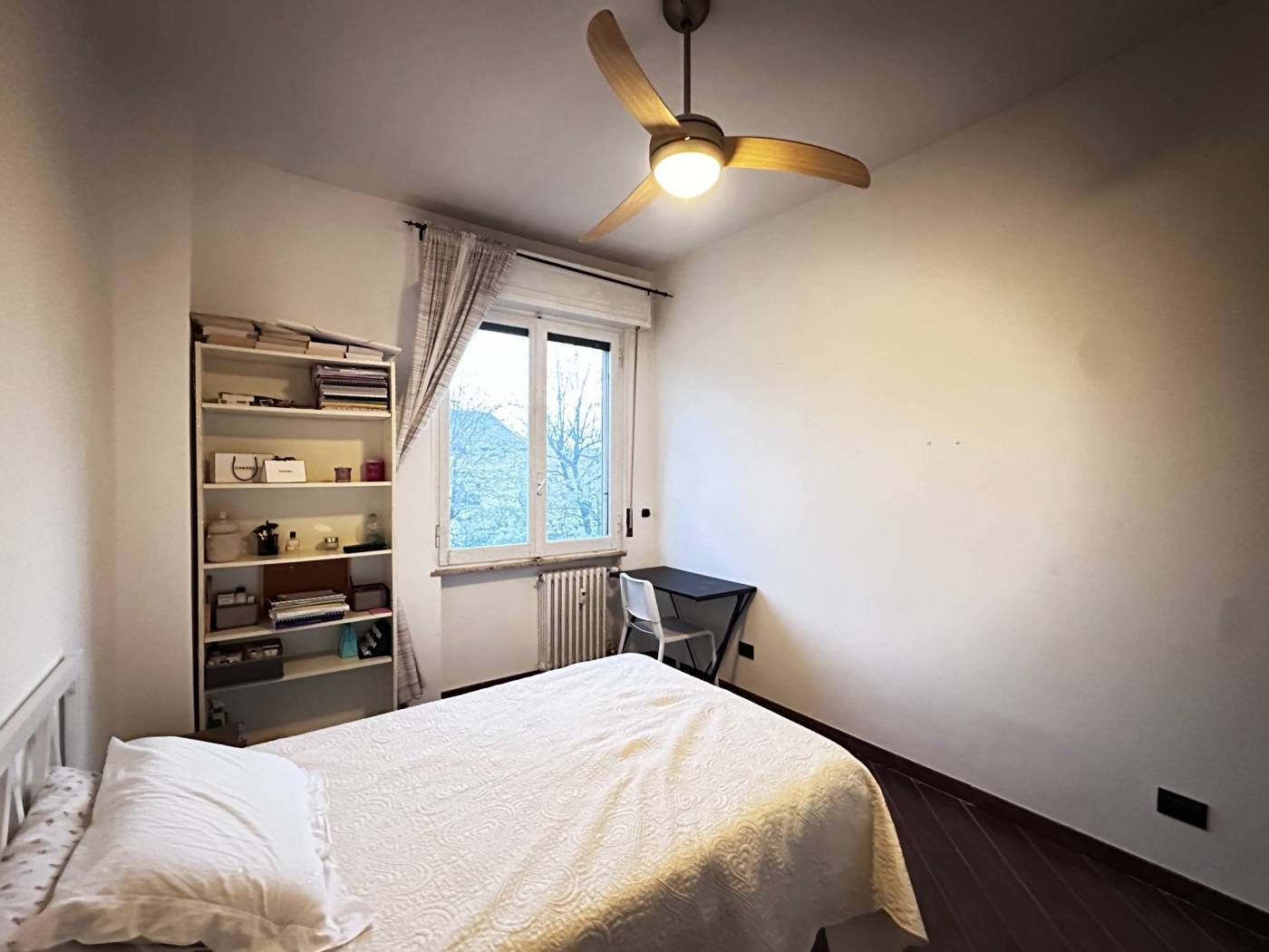 La camera è arredata con letto piazza/mezzo con struttura, due comodini, armadio a due ante con cassetti, libreria e scrivania con sedia.